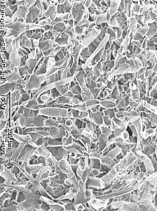 Também foi feita microscopia eletrônica de varredura (MEV) da amostra de papel para análise da disposição das fibras de algas filamentosas no produto final