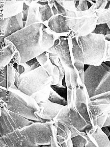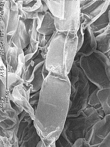 - Microscopia eletrônica de varredura (MEV) na amostra de papel feita com algas filamentosas.