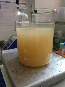 A polpa passou então para um recipiente contendo uma solução de hipoclorito de sódio 0,1% e hidróxido de sódio em quantidade suficiente para ajustar o pH da solução para 11. Nesta mistura, a polpa permaneceu até seu completo branqueamento, o que ocorreu e, torno de vinte minutos. Após este período, a polpa foi escorrida em tela de nylon e posteriormente imersa em água limpa, sendo este procedimento necessário para a retirada dos resíduos químicos da solução branqueadora. Foram feitas três lavagens semelhantes de duração de dez minutos cada.